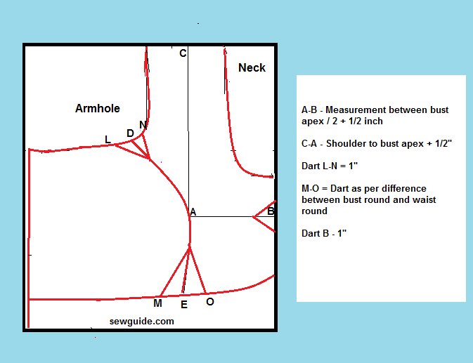 A to o or b to o= (o to c)/2. Watch video for more clarification:.. For bust size of 30 1/2 to 32 inches you can make a bust dart of 1/2 inch;